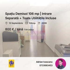 Se închiriază spațiu de 106 mp utili, la demisol, cu intrare separată direct din strada Mihail Sebastian, sector 5. Chirie: 800 euro/lună. ( inclus TVA ) Utilități INCLUSE în preț: apă, curent, mentenanță, paza, receptie. Cost fix lunar. Spațiul este open space, ușor de organizat sau compartimentat. Are ...