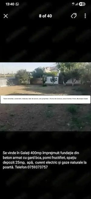 Se vinde in Galati, teren 700 mp, lotizat 300+400 mp împrejmuit, fundatie din beton armat cu gard bca, poarta acces auto culisanta, poarta de picior, pomi fructiferi, spațiu depozit 25mp, apă, curent electric si gaze naturale la poartă. Teren în proprietate exclusiva, intabulat, liber de sarcini. Este ...