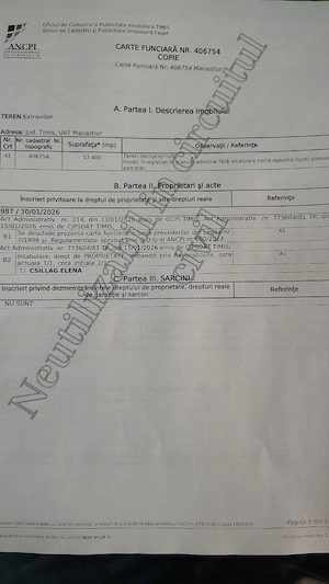 Vand 2, 32 teren agricol in comuna Traian Vuia, in apropiere de raul Bega, CF la zi 18500 euro negociabil