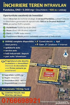 SE INCHIRIEAZA SAU VINDE TEREN Oraș FUNDULEA Bdul 22Decembrie nr 2, la întrare în Fundulea, 5000mp cu deschidere 100 m la Drumul Național DN3,Teren unicat,beneficiind de toate utilitățile, și de o poziție excelenta, prezintă oportunități de investiție variate: dezvoltare imobiliara, comercială sau industrială, ...